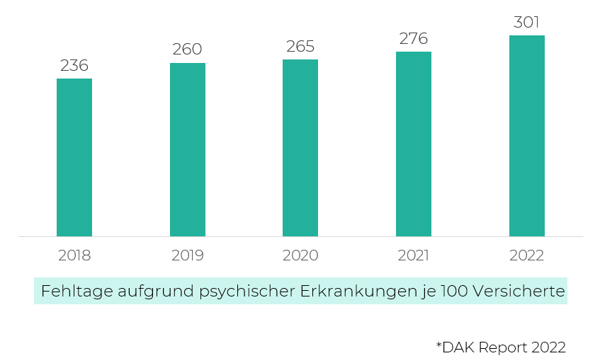 Zum Glück wurden wir zur Beantwortung dieser Fragen von Plan G an die Hand genommen, mit besonderer Unterstützung (damals wie heute) von unserer Mentorin HFT-Innovationsmanagerin Elena Schön. Und so kam dann die Idee auf, dass wir uns mit psychischer Gesundheit am Arbeitsplatz beschäftigen wollen – ein Thema, das zunehmend relevanter wird. Die Studien und Zahlen sprechen für sich.