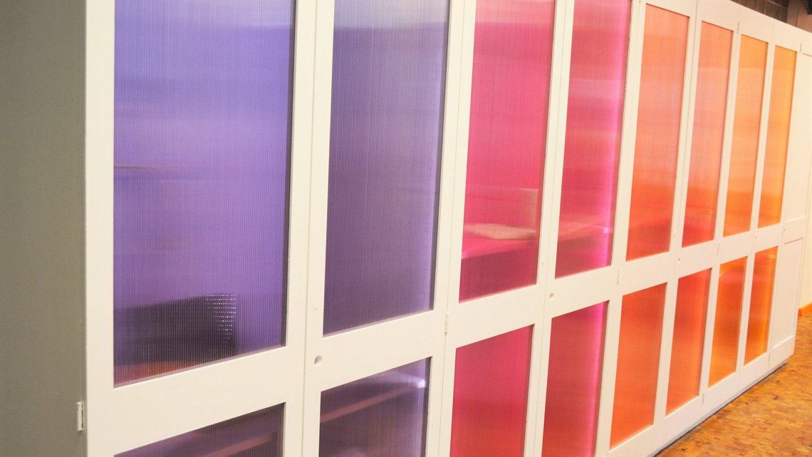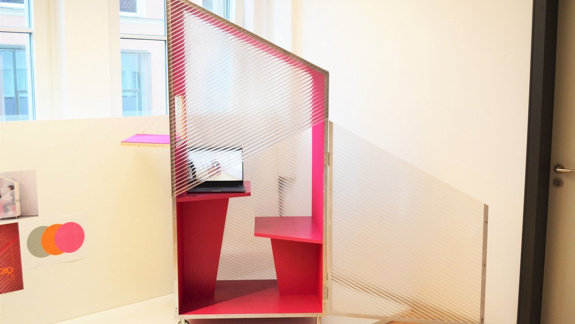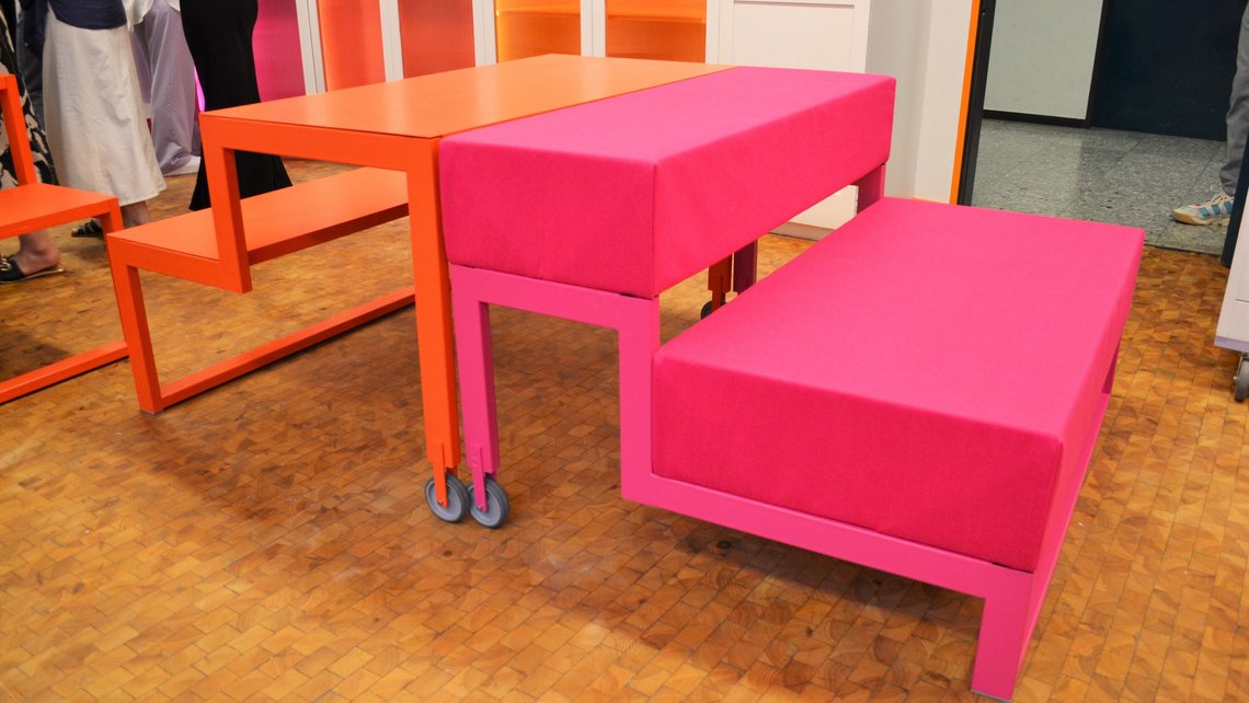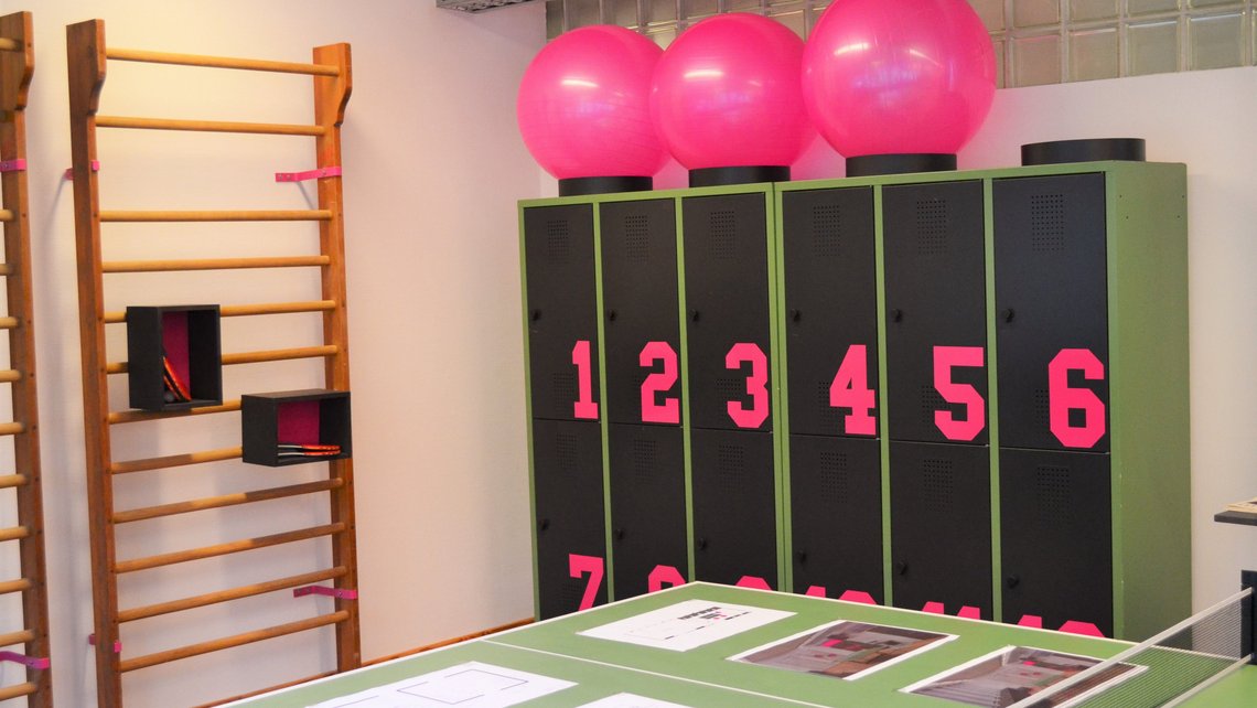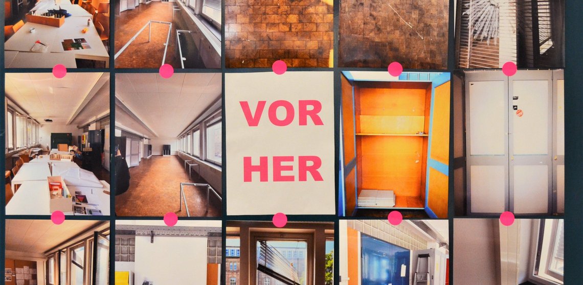 Die ursprünglichen Gegebenheiten des Raums wurden von den Studierenden kreativ ausgelotet und produktiv genutzt. Oder umgenutzt! So wurden vorhandene Einbauschränke aufgearbeitet und zu individuellen Lernnischen umfunktioniert. Sitzmöbel und Tische wurden weitestgehend aus wiederverwendeten Materialien hergestellt. Eine alte Tischtennisplatte dient zukünftig als Besprechungs- und Arbeitstisch und Möbel aus Stahlrohr lassen sich flexibel als Tisch-und-Stuhl-Set oder Sitzreihe kombinieren. Alte Schließfächer wurden repariert, umweltfreundlich lackiert und stehen nun als Raumteiler und Präsentationsfläche zur Verfügung.